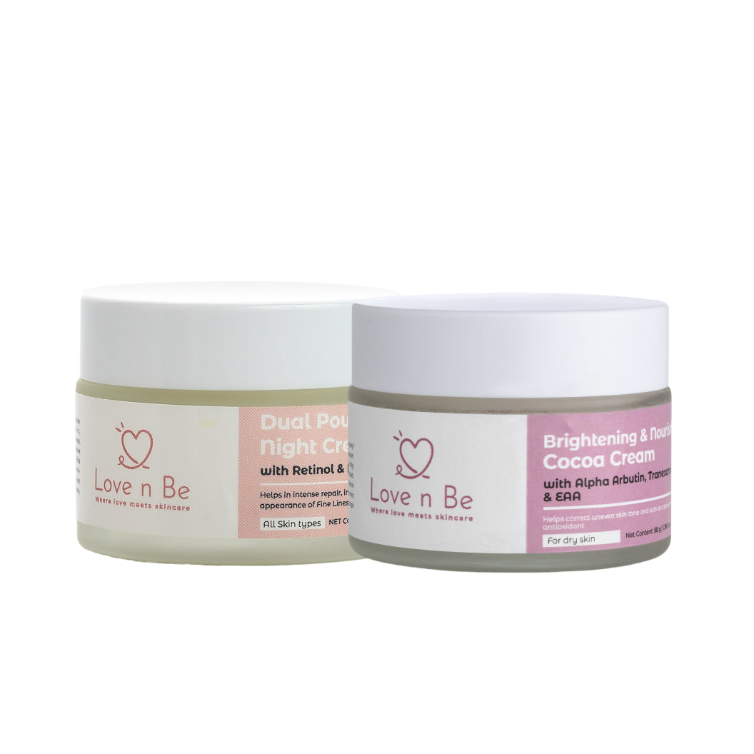 The Day Night Care Combo is a simplified, effective skincare duo that provides full-day nourishment and overnight repair. Start your mornings with the Brightening & Nourishing Cocoa Cream, infused with Alpha Arbutin, Tranexamic Acid, and Shea Butter to hydrate, fade dark spots, and add a radiant glow. At night, apply the Dual Powered Night Cream to target early signs of aging, smoothen skin texture, and deeply replenish moisture. Designed for those who want essential skincare without the clutter, this 2-step combo addresses dryness, pigmentation, and dullness effortlessly.