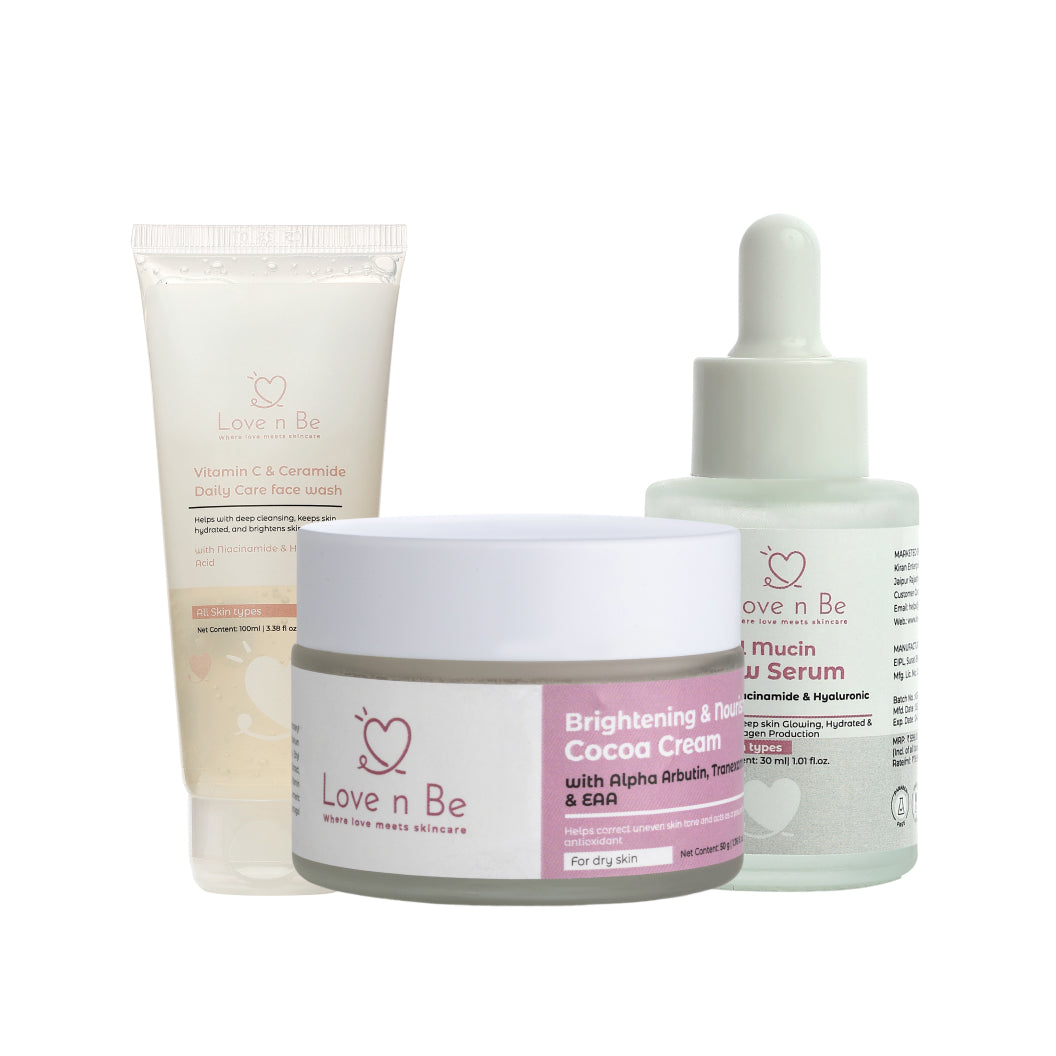 The Winter Glow Combo is a complete 3-step skincare routine designed for dry and tired winter skin. Begin with the Vitamin C & Ceramide Face Wash to gently cleanse without stripping moisture. Follow with the Snail Mucin Glow Serum, packed with skin-repairing and collagen-boosting nutrients. Finish with the Brightening & Nourishing Cocoa Cream to lock in hydration and give your skin a soft, luminous finish. This combo helps fight winter dullness, uneven skin tone, and dehydration all while strengthening your skin barrier and improving overall texture.